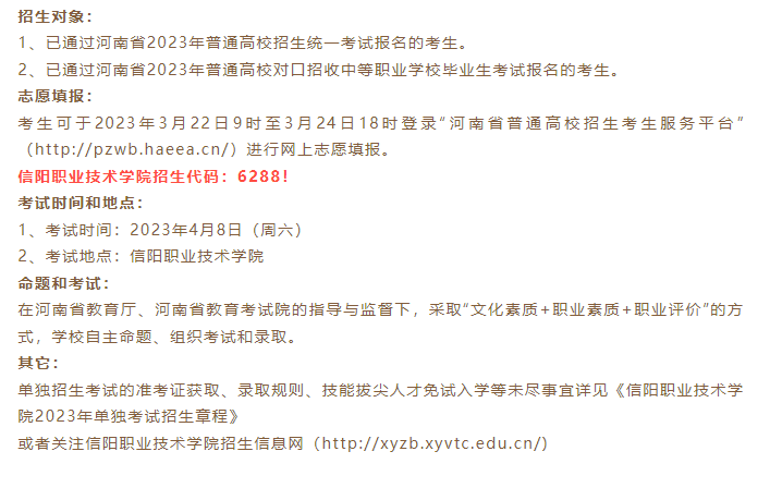 信阳职业技术学院是一所经河南省人民政府批准、由教育部备案的全日制普通高等职业公办专科学校,占地面积2000余亩,由原信阳师范学校、信阳教育学院、信阳卫生学校、信阳商业学校合并组建而成,学校传承于1903年建立的豫南道立师范学堂,已有120年的办学历史和文化积淀。学校先后获评“全国文明单位”“全国职业教育先进单位”“全国卫生职业教育教学改革先进院校”“全国百所德育科研名校”“河南省职业教育品牌示范校”“河南省省级优质专科高等职业院校”“河南省高水平高等职业学校和高水平专业建设工程建设单位”。