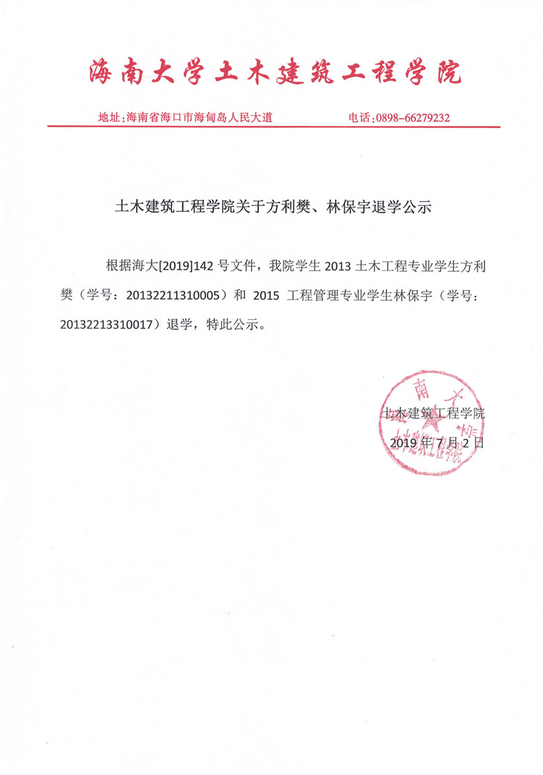 350vip8888新葡的京集团关于方利樊、林保宇退学的公示