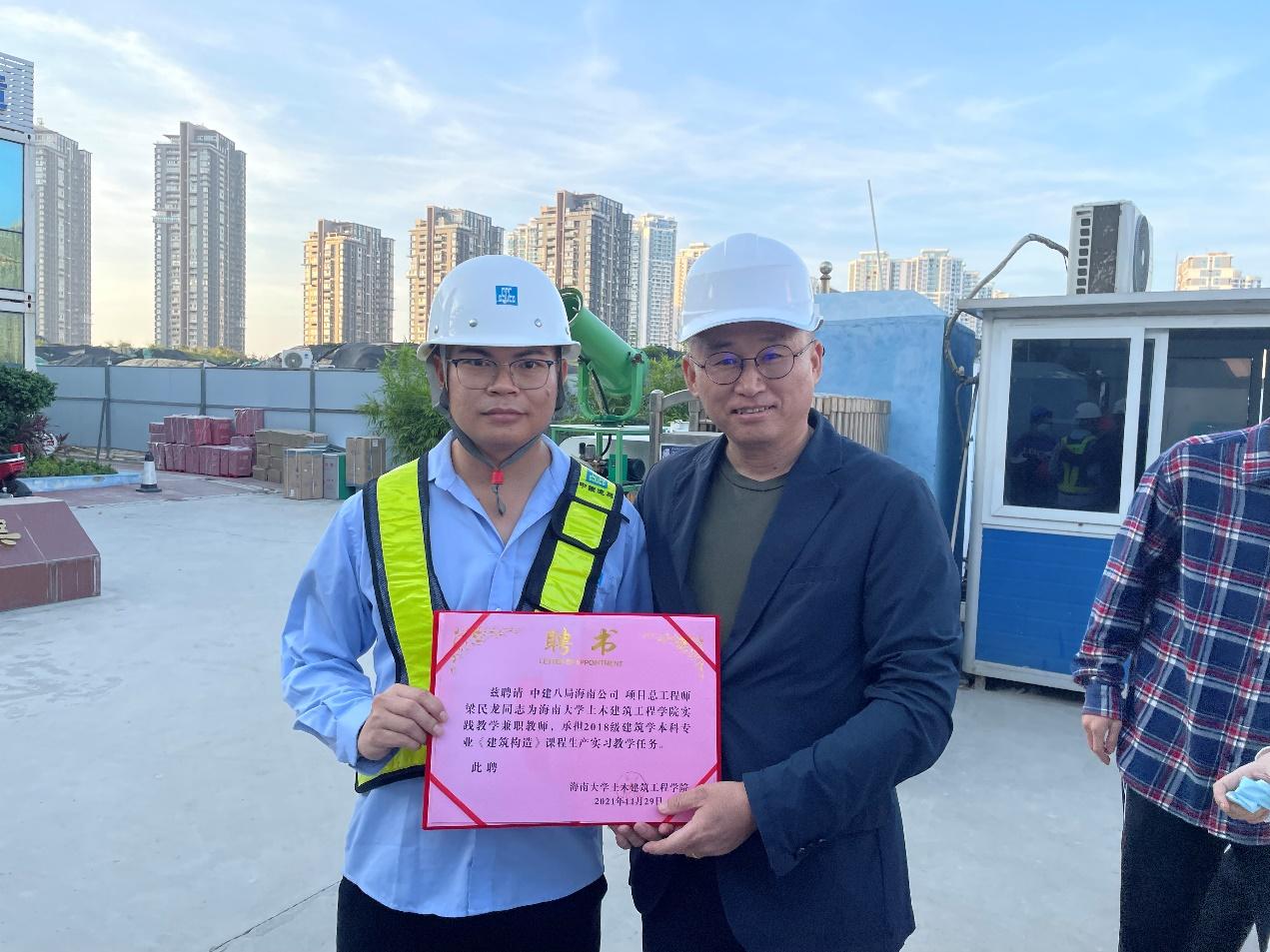 华彩·海口湾广场项目参观开始前,中国建筑第八工程局有限公司的海南公司梁民龙作为项目总工程师,针对项目的玻璃幕墙工程在会议室给学生们做了精彩的报告,详细地介绍了玻璃幕墙的结构组成、特点分析、材料加工工艺、转角部位安装难点等内容。报告结束后,老师和项目施工现场负责人带领学生到施工现场实地参观。参观过程中,以老师讲解学生提问的方式,把实际工程和课本上的理论知识相结合,加深了学生对玻璃幕墙的认知和理解。参观结束后,陶老师给工程师梁民龙颁发聘书,聘请中建八局海南公司项目总工程师梁民龙同志为350vip8888新葡的京集团实践教学兼职教师,承担2018级建筑学本科专业《建筑构造》课程生产实习教学任务。