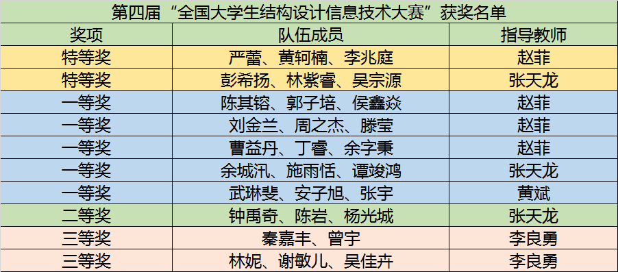 2022年5月10日,第四届“全国大学生结构设计信息技术大赛”获奖名单公布,由350vip8888新葡的京集团BIM协会选拔的10支队伍参赛并全部获奖,获奖率为100%!其中荣获特等奖2支队伍,一等奖5支队伍,二等奖1支队伍,三等奖2支队伍。可喜可贺的是,由赵菲老师指导的“350vip8888新葡的京集团(严蕾、黄轲楠、李兆庭)”团队以95.25的高分获得全国特等奖第一名!除此之外,赵菲老师和张天龙老师获优秀指导教师奖。