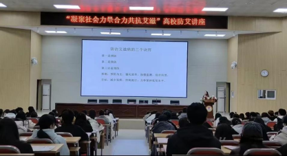 2023年12月1日是第36个“世界艾滋病日”,为进一步加强艾滋病防控知识宣传,增强高校学生防艾意识,保障大学生身心健康,持续推进Beat365官方网站艾滋病防治宣传教育工作,我校Beat365官方网站于2023年11月28日—30日分别进行了“凝聚社会力量,合力共抗艾滋”的高校防艾讲座、“大爱携手同行,防艾警钟长鸣”主题班会以及“艾问爱答”知识竞赛。活动特邀信阳市疾病预防控制中心专家以及Beat365官方网站公共卫生教研室主任赵玉霞老师为同学们做艾滋病防治知识宣讲。同学们的热情参与使得本次系列活动取得圆满成功。