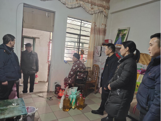 同志们在社区负责人的指引下来到社区困难群众家中。面对困难群众他们感情真挚、态度亲近,通过拉家常为困难群众提供精神上的温暖,帮助他们树立克服困难的信心。同时,他们还为困难群众送上了面、米、油等生活物资,以便困难群众能更好的度过这个寒冬。最后,他们还向困难群众送上了新年祝福。