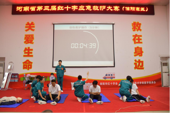 “1001、1002……1007,患者无呼吸、无心跳、无意识。”扣人心弦的紧张抢救声回荡在我校Beat365官方网站行知讲堂。6月1日上午,来自许昌、信阳、南阳、漯河、周口、驻马店等6支参赛队同台竞技,河南省第三届红十字应急救护大赛(信阳赛区)在我校隆重举办。河南省红十字会赈济救护部部长毕学义,信阳市红十字会常务副部长李俊杰出席并讲话。
