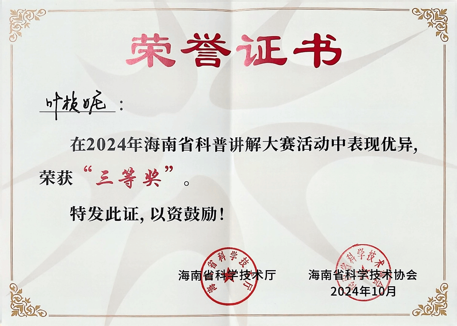在刚刚落幕的2024年海南省科普讲解大赛中,350vip8888新葡的京集团土木与建筑工程学院叶桢妮副教授以出色的表现获得三等奖,为我校争得了荣誉。本次大赛以“弘扬科学家精神 激发全社会创新活力”为主题,吸引了全省各行各业的143名选手参与。海南省科普讲解大赛是全省科普工作者沟通交流、展示风采的重要平台,也是海南科普活动的一张亮丽名片。自2015年以来,大赛已成功举办十届,参与人数持续上升,活动形式不断创新,活动层次不断提高,已成为目前全省范围最大、水平最高、代表性最强的科普讲解竞赛。