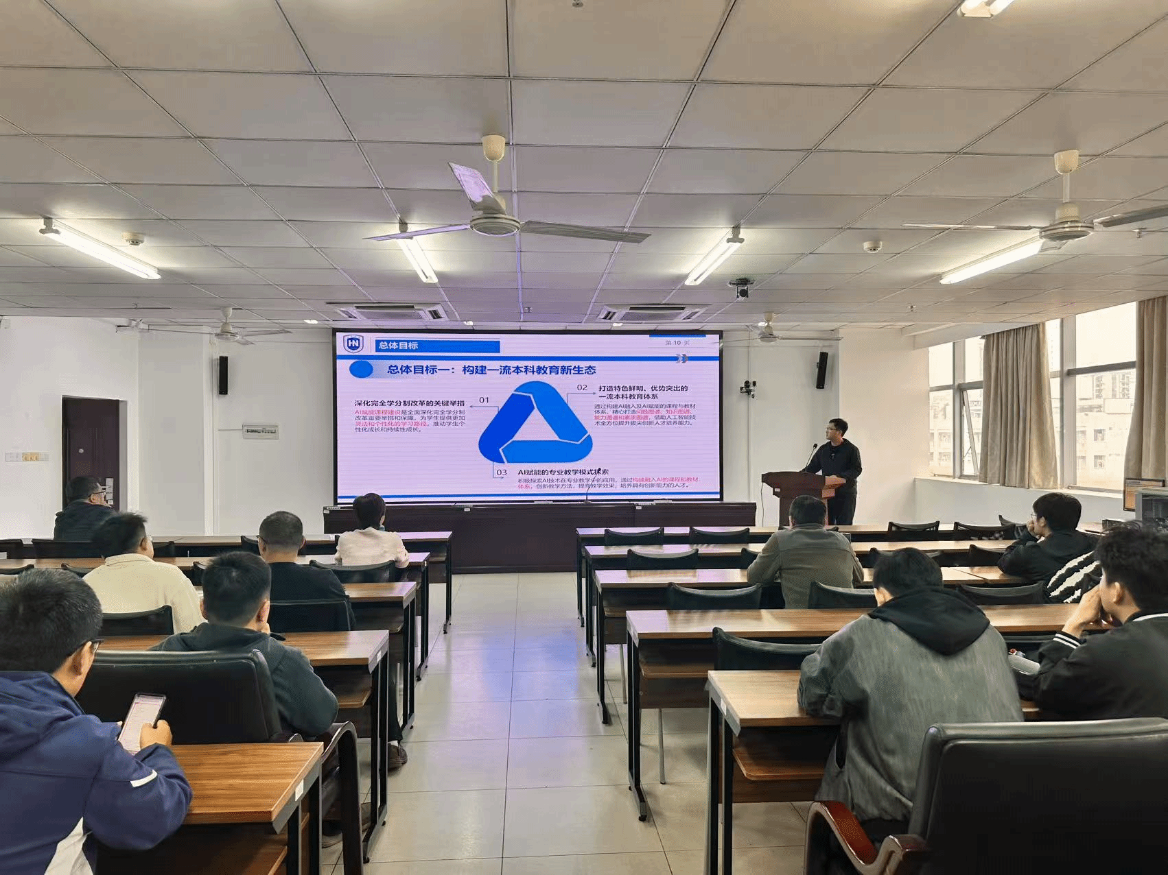 甘江璋老师从AI赋能教学政策、AI大模型及应用、AI赋能教学实施三个方面,总体阐述了AI赋能教学改革的两个目标、五大任务;解读了AI大模型及应用的使用技巧,通过案例生动地展示了AI在日常工作、学习、教学前准备工作中的应用场景。