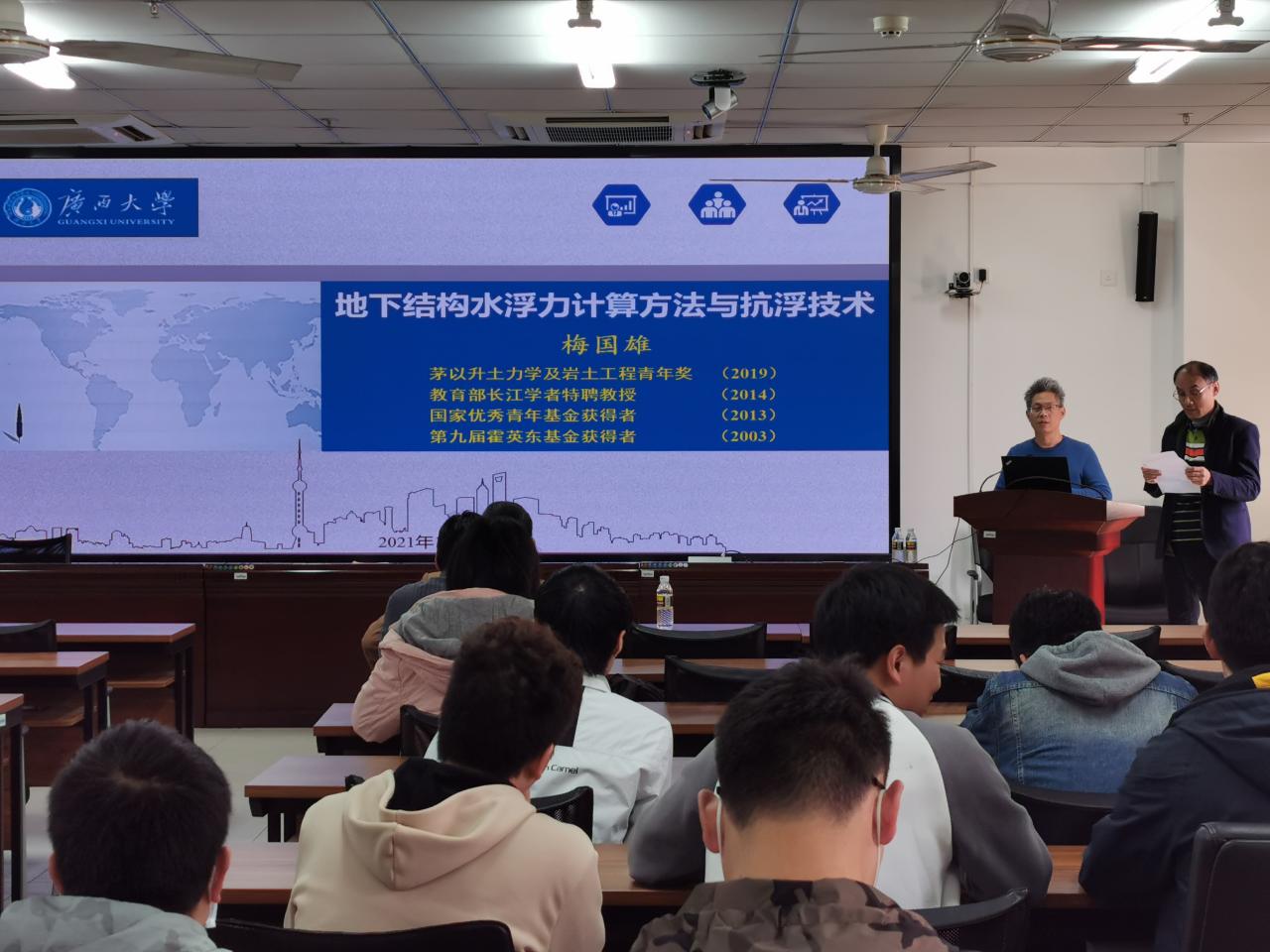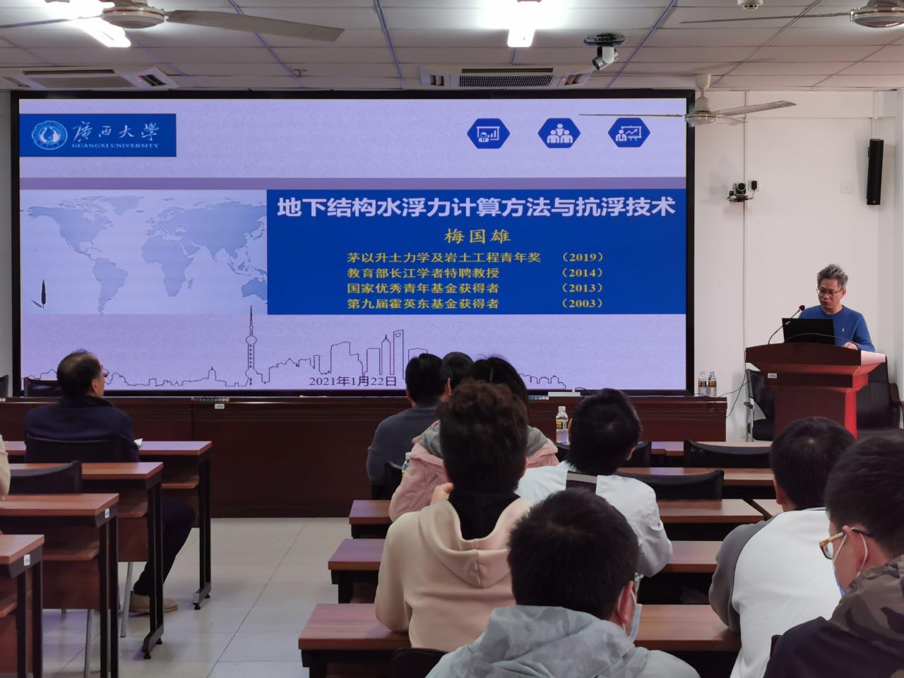 2021年1月22(周五)下午2:00-3:00点广西大学工程防灾与结构安全教育部重点实验室主任梅国雄应新葡京官网周智院长的邀请,在350vip8888新葡的京集团研发楼510报告厅做《地下结构水浮力计算与抗浮关键技术》学术报告。报告会由张友良副院长主持,我院教师和研究生近30人参加了此次学术报告会。