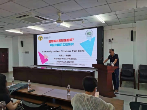 5月21日下午,新葡京官网有幸邀请到了东南大学350vip8888新葡的京集团副院长、博士生导师李德智教授带来主题为“智慧城市是韧性的吗?—来自中国的实证研究”学术报告。本次学术报告的主持人是新葡京官网副院长张友良教授。讲座伊始,张友良院长介绍了本次学术报告的主题及李德智教授的基本情况。新葡京官网教师和研究生,相关专业的本科生聆听了报告会。