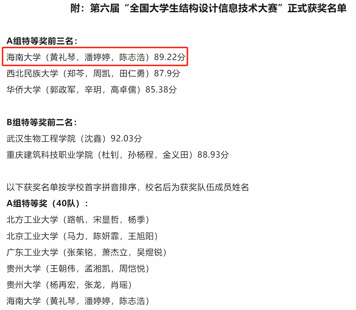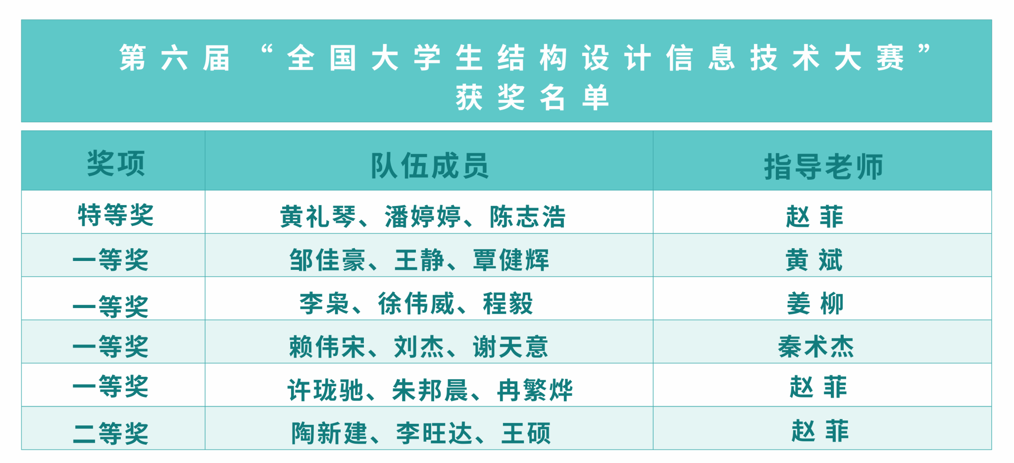 2024年5月20日,经过大赛首次特等奖答辩,第六届“全国大学生结构设计信息技术大赛”正式获奖名单公布,新葡京官网学生团队在本次大赛中再创佳绩。荣获特等奖1支队伍,一等奖4支队伍,二等奖1支队伍。值得庆贺的是,由赵菲老师指导的“350vip8888新葡的京集团(黄礼琴,潘婷婷,陈志浩)”团队以89.22的高分荣获全国特等奖第一名!除此之外,赵菲老师还获得了优秀指导老师奖。他们的出色表现不仅为学院赢得了荣誉,更是生动诠释了我校学子追求卓越、不断超越自我的精神面貌,激励着更多学子在未来的征程中不断砥砺前行,创造更加辉煌的成绩。