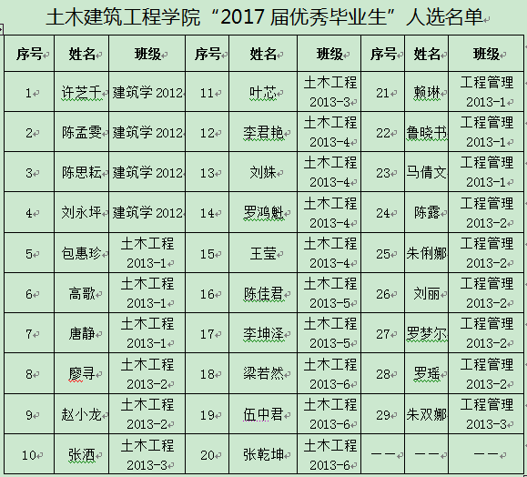 根据学校相关通知要求及《350vip8888新葡的京集团“三好学生”“优秀学生干部”“优秀毕业生”“最具创新精神和实践能力的大学生”评选实施细则》相关规定,经班级推荐,学院审核,拟推荐鲁晓书等29人为上报学校的“2017届优秀毕业生”人选,现予以公示。公示期为:2017年5月31日—2017年6月2日。在公示期内,如有异议,请于2017年6月2日17:40前向学工办(研发楼319室)提出。