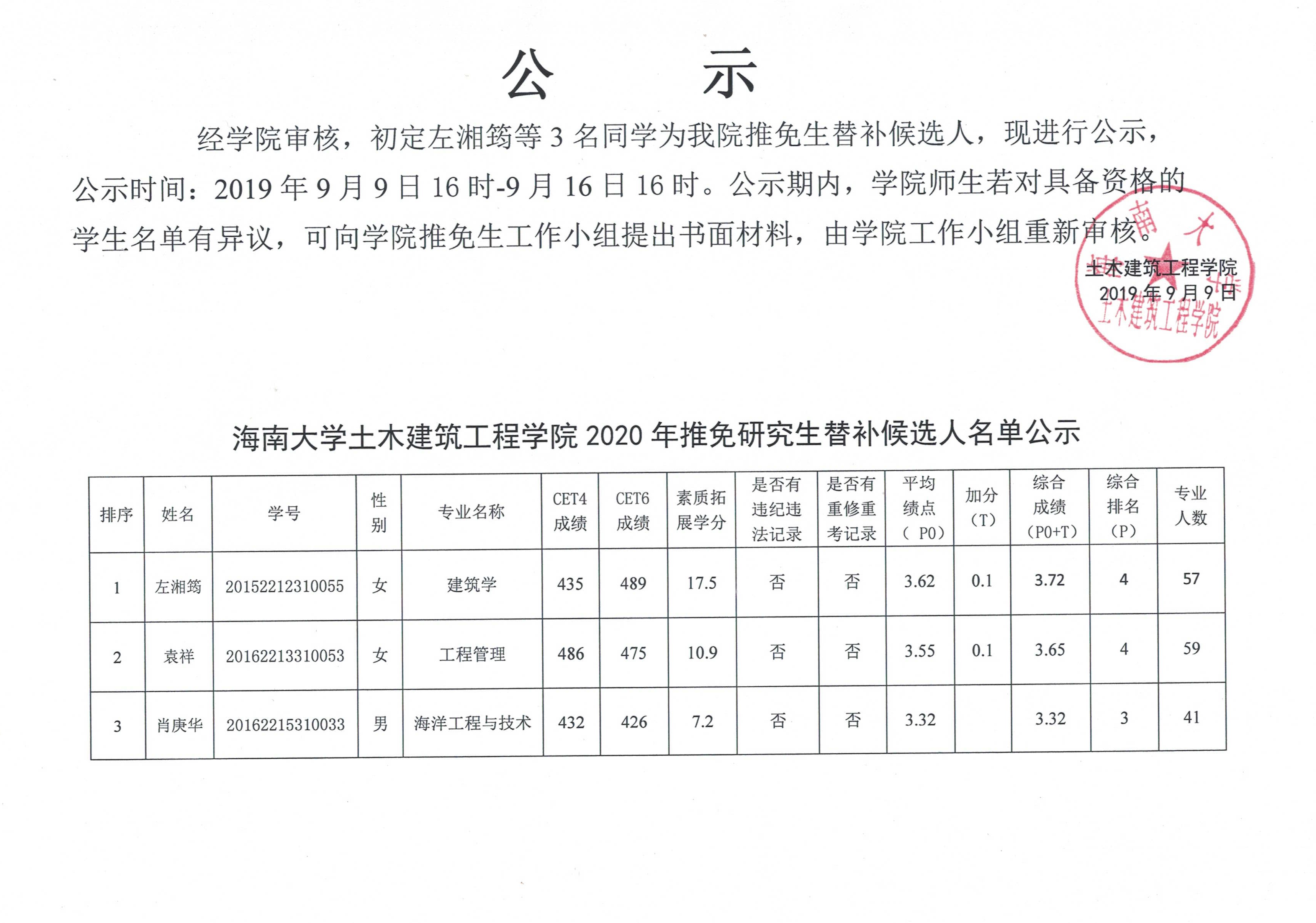 350vip8888新葡的京集团2020年推免研究生替补候选人名单公示