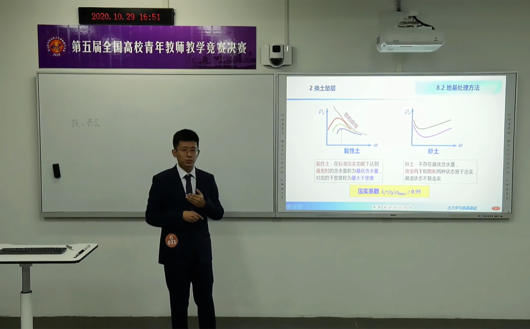 路平老师的参赛课程名称为《土力学与地基基础》。“九层之台,起于垒土”,可见地基土在工程建设中的根基地位;在当前海南自由贸易区建设的战略部署下,高峡平湖、穿江跨海、基深千尺、楼高万丈,土力学与地基基础贯穿着每一个工程领域。参赛课程随机抽取的演示内容为“20-地基处理方法”,围绕软弱地基处理中要遵循的三个原则,针对两大类处理方法,利用生活中简单的豆腐受压类比,从现象出发,探究机理,提炼方法。课堂巧用鱼豆腐、冻豆腐的引入,提高学生的学习兴趣,加深学生的感性理解,从承载力的验算方法展开逐层讨论,频繁提问,让学生跟着走,升华认知。让专业回归基础,理论联系实践;课程思政如盐入水,研究前沿启发创新。课程深刻体现了“以学生为本”的教学理念,知识传授是基础,能力培养是重点,价值塑造是提升。