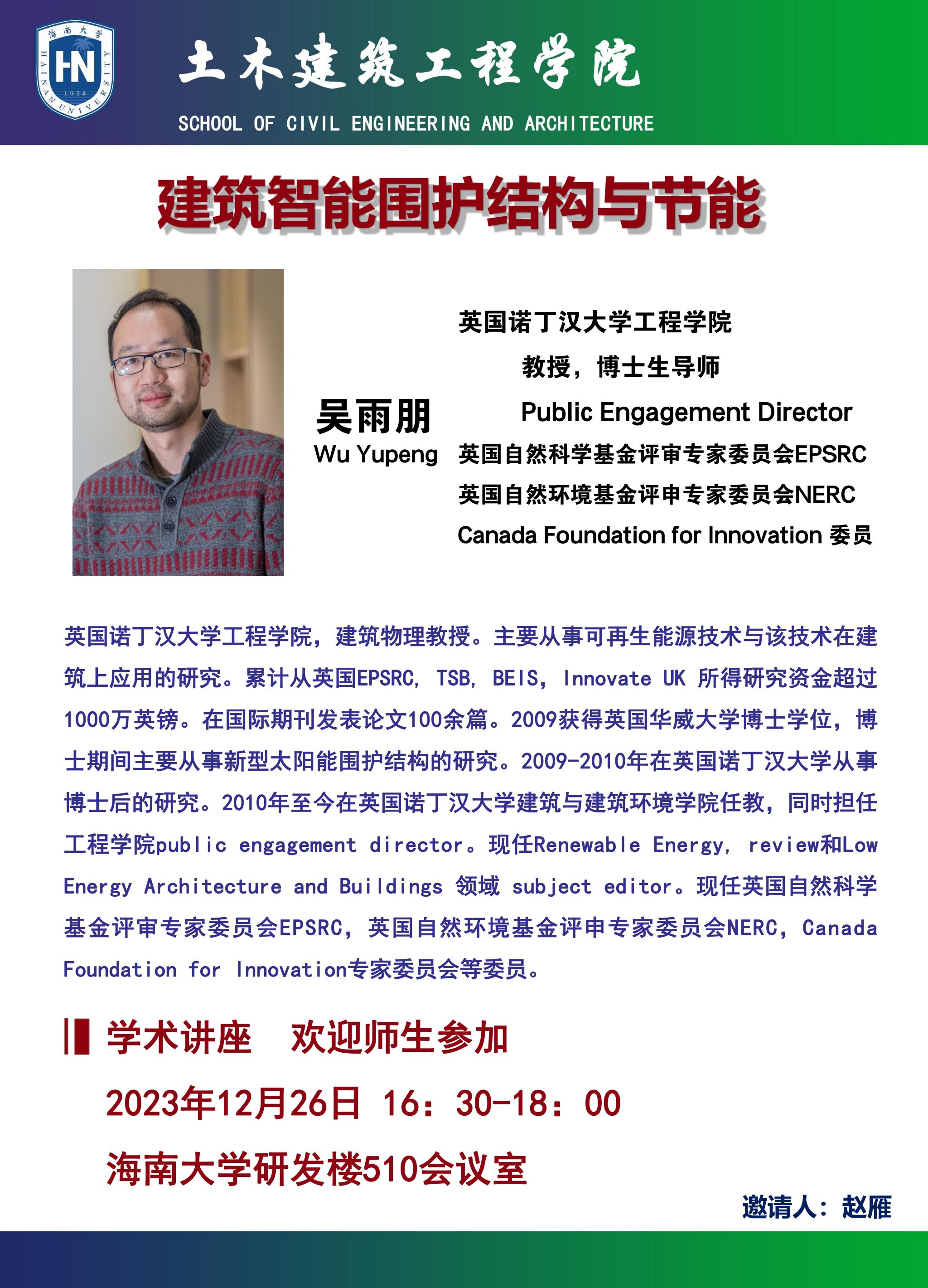 12月26日(周二)16:30-18:00在350vip8888新葡的京集团研发楼510会议室,英国诺丁汉大学工程学院教授,博士生导师 Public Engagement Director(英国自然科学基金评审专家委员会EPSRC、英国自然环境基金评申专家委员会NERC、Canada Foundation for Innovation 委员),在新葡京官网做《建筑智能围护结构与节能》学术报告。欢迎有兴趣的师生参加。