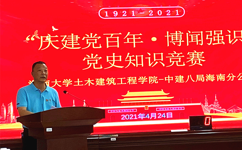 4月24日,350vip8888新葡的京集团中国建筑第八工程局有限公司海南分公司联合举办“庆建党百年·博闻强识”党史知识竞赛活动。350vip8888新葡的京集团党委书记卢江海、副书记孙晓媛、副院长邱宙廷、学工办主任李江俊,中建八局海南分公司工会主席李诚、安全总监李神养、综合部主任邵青晓及百余名师生参加了活动。