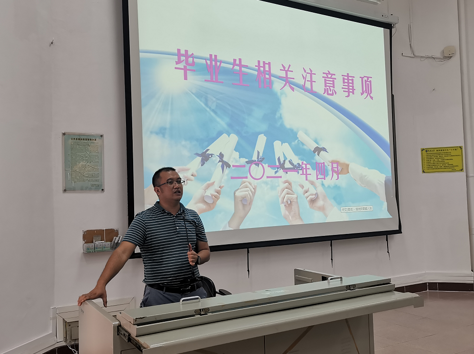 随后,学工办副主任詹达夫老师对毕业生工作涉及到的离校管理与手续办理、报到派遣、户口迁移等做了详细的讲解;对各项工作开展的时间节点、毕业生容易忽视的细节问题进行了说明;向毕业生们开展了诚信教育。并提醒全体毕业生,毕业离校前,需要办理的事务比较多,同学们可以列一个事项事务时间表,逐项完成,不要遗漏。