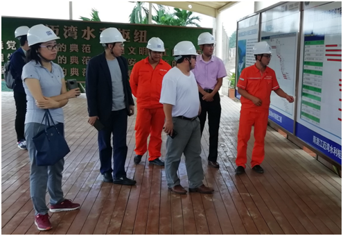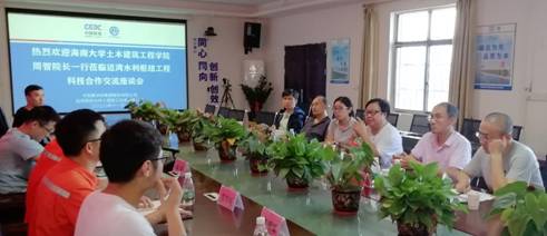 土建学院领导和老师与项目经理熊星,项目总工程师肖伟明等众多技术人员进行了深入交流。在施工现场,萧总工程师对迈湾水利枢纽工程进行了详细介绍。在后续讨论中,技术人员提出了很多工程中存在的难点,例如海南气候变化对施工进程的影响、混凝土施工中的温度控制问题。老师们针对工程中的难点提出了一些解决方案,例如,大体积混凝土施工过程中温度场把控非常重要,尤其是要注重施工过程中的温度差,基于此,采用超算监控温度场,进一步指导混凝土施工,从而保障工程质量。