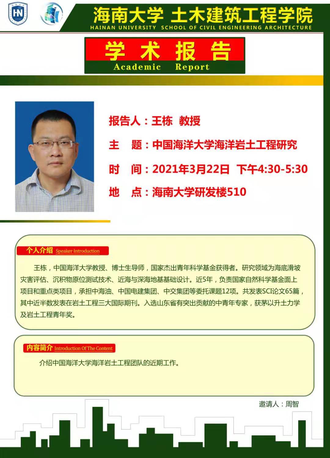 3月22日(周一)下午4:00-5:30点在350vip8888新葡的京集团研发楼510,中国科学院武汉岩土力学研究所,博士生导师汪稔研究员和中国海洋大学王栋教授分别在新葡京官网做题为《岛礁建设对“一带一路”倡议的贡献》和《中国海洋大学海洋岩土工程研究》。请有兴趣的老师和没有课的研究生务必参加,到时会做参会签名,考勤记录。特此通知 学科与科研办 2021年 3月21日