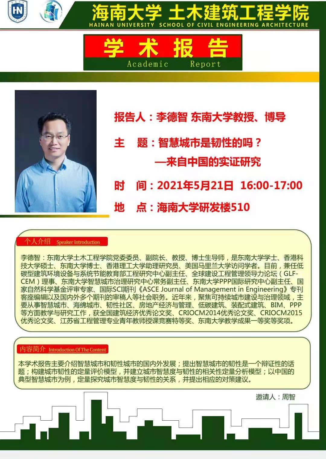 5月21日(周五)16:00-17:00点在350vip8888新葡的京集团研发楼510,东南大学土木工程学院副院长、博士生导师李德智教授在新葡京官网做题为《智慧城市是韧性的吗? —来自中国的实证研究》学术报告。欢迎有兴趣的老师和没有课的研究生参加。特此通知