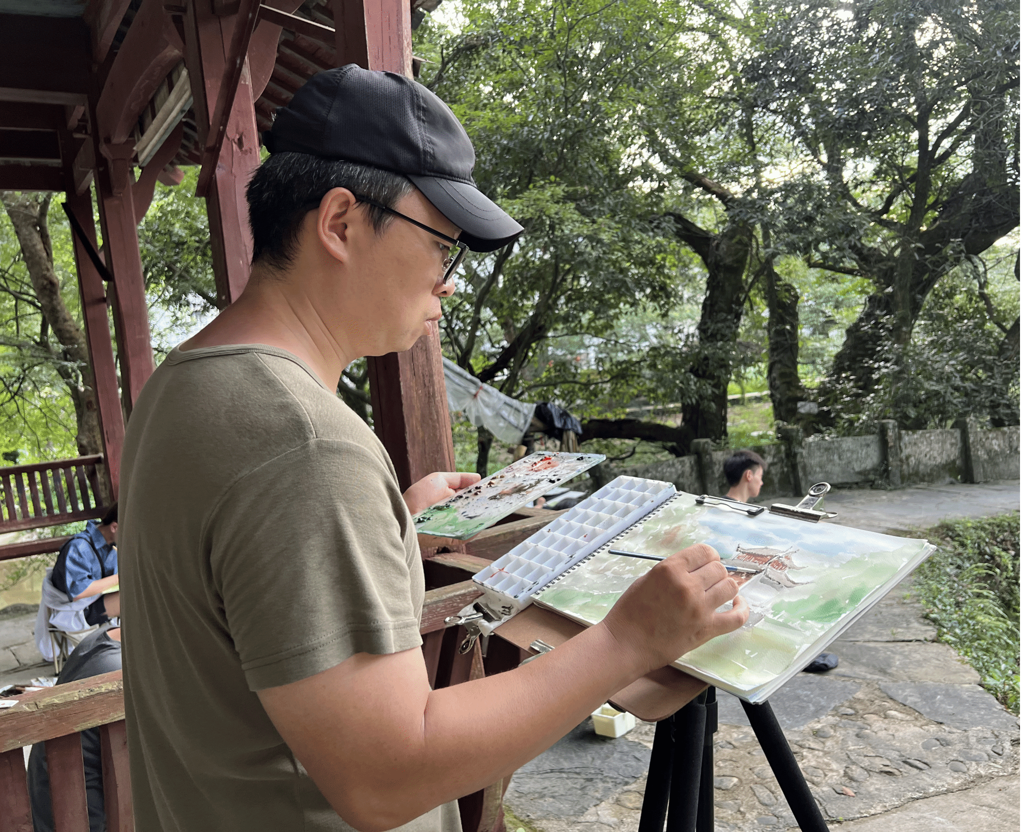 齐飞老师在不同取景处为同学们示范了水彩写生步骤,并针对不同学生的问题进行指导解答。在傍晚评图时,齐飞老师还统一强调了绘制建筑速写的关键点,对提升学生建筑表达技法深有助益。